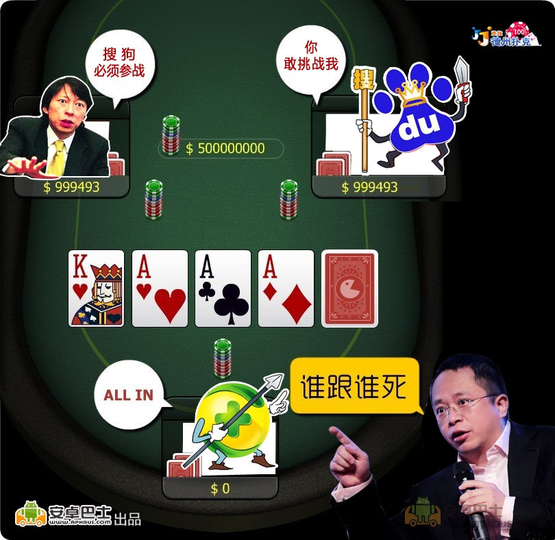 3SB打德州扑克 360开始拦截百度首页 发表于2012 年 9 月 9 日由Wu 3SB打JJ德州扑克,都觉得自己筹码多有优势,百度加注,搜狗跟注,都想看看底牌,没想到360居然直接All in了,百度有钱果断也跟着All in,张朝阳说,搜狗必须ALL in ,现在等着看最后一张底牌了 另据 techweb副主编@魏力:360安全浏览器,拦截百度首页了
